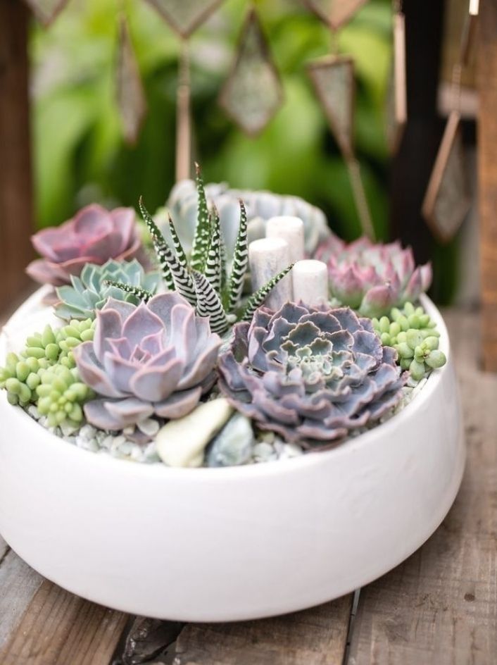 All’interno del vaso, si sviluppa una curata composizione di piante grasse e succulente (tra cui Cactus vari e la resistente Sansevieria), che formano un affascinante mini-paesaggio desertico.