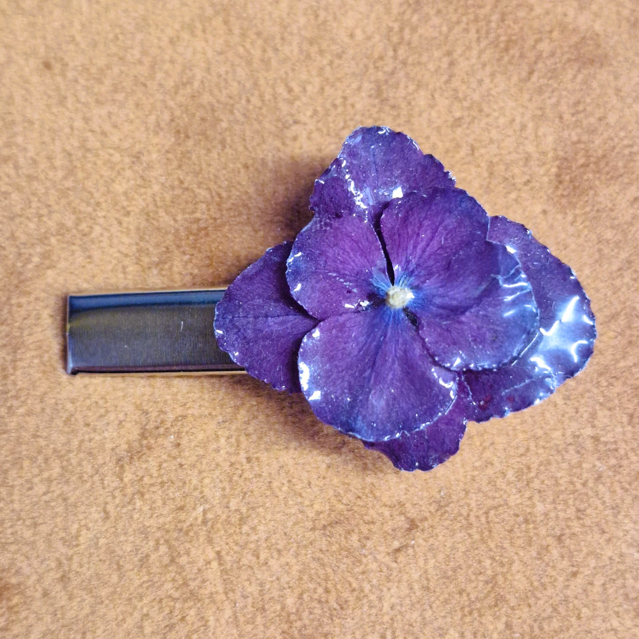 Ogni fermaglio è realizzato con due petali di Ortensia trattato con la nostra tecnica Hydra. Il fiore viene incapsulato in resina cristallina, che ne fissa il ricco colore bordeaux e lo rende leggero, lucido e resistente nel tempo.