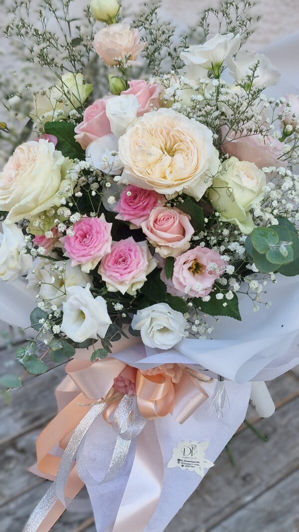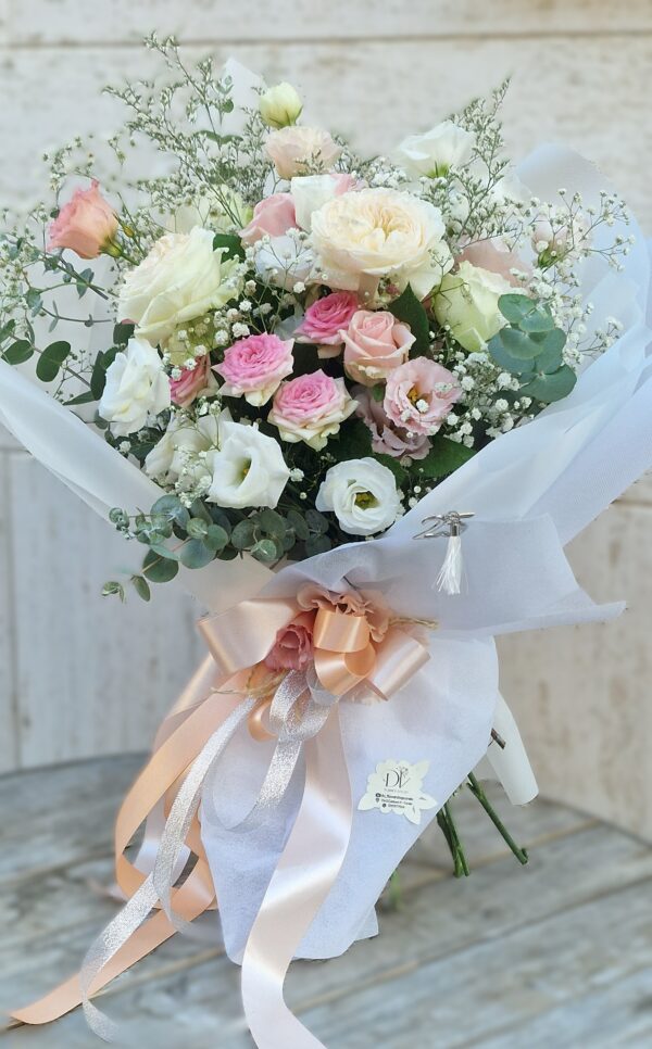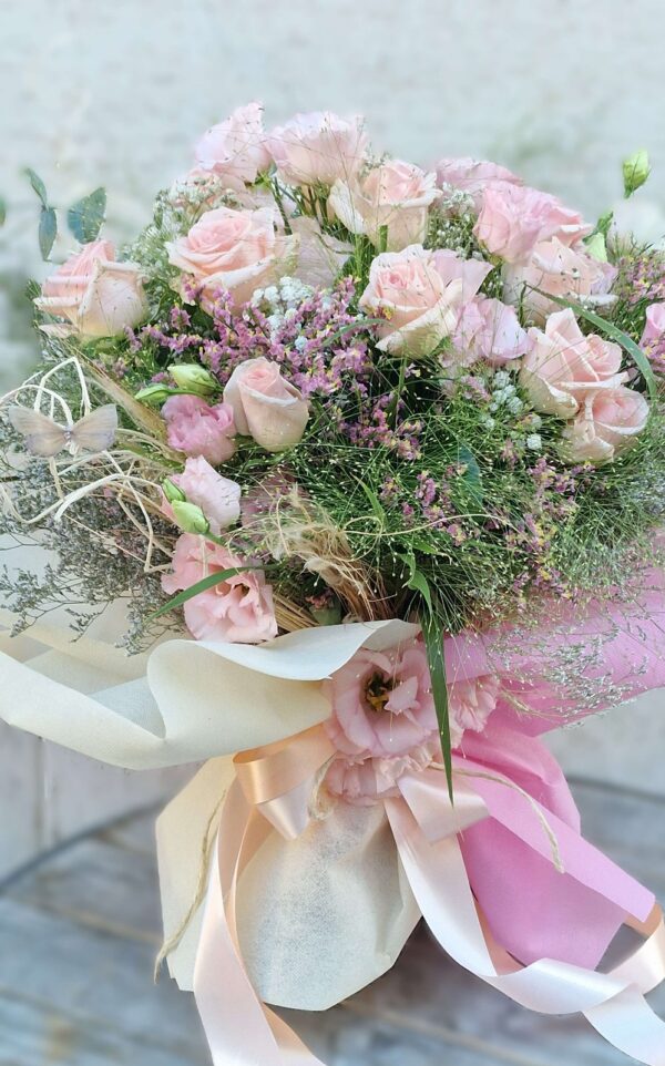 - Armonia Pastello: All’interno, una delicata sinfonia di Lisianthus (Eustoma) in tonalità lilla lavanda e rosa cipria simboleggia la tenerezza e la bellezza continua del vostro amore. I boccioli verde-chiaro aggiungono un tocco di freschezza primaverile.