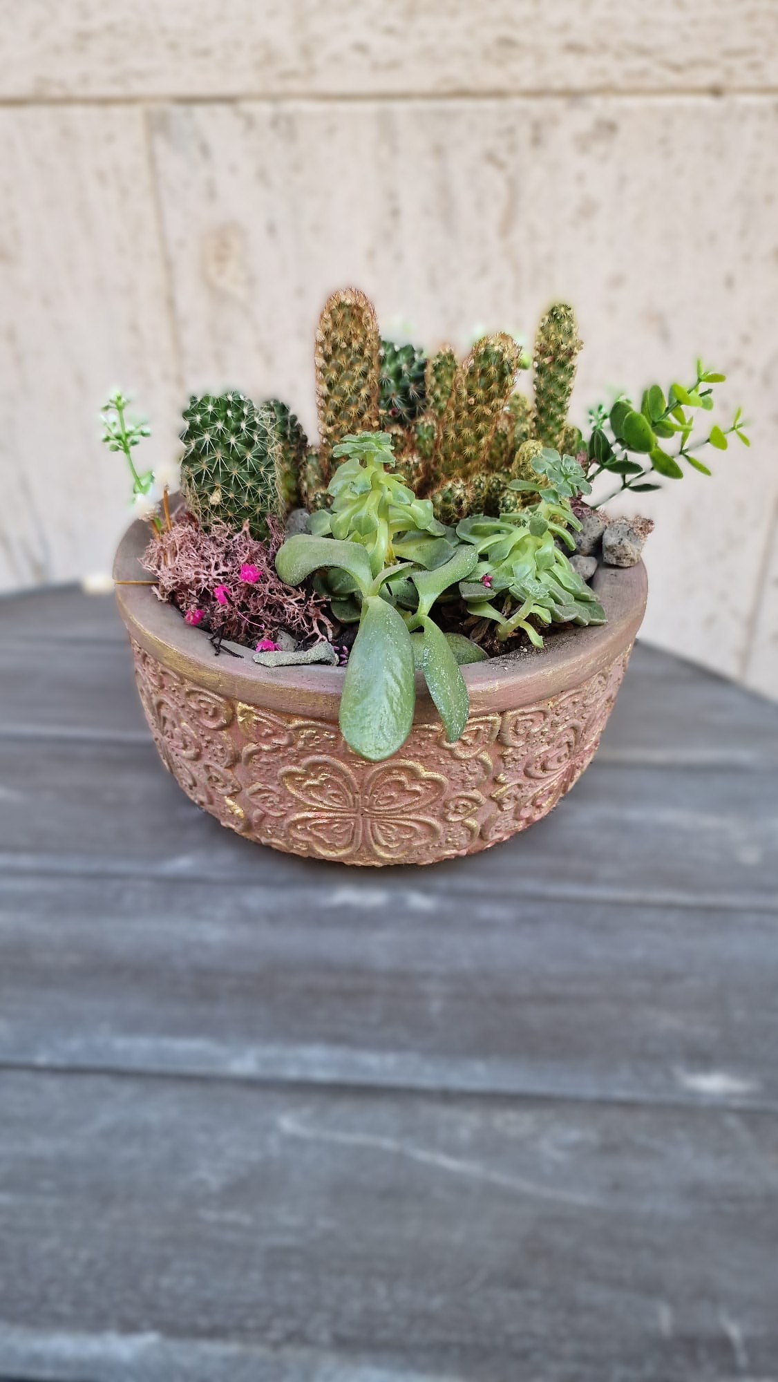 - Facilità di Manutenzione: Le piante succulente selezionate (tra cui splendidi cactus e varietà di Echeveria) sono note per la loro resistenza e richiedono pochissime cure. Ideali per chi non ha il “pollice verde” ma desidera una decorazione viva e duratura.